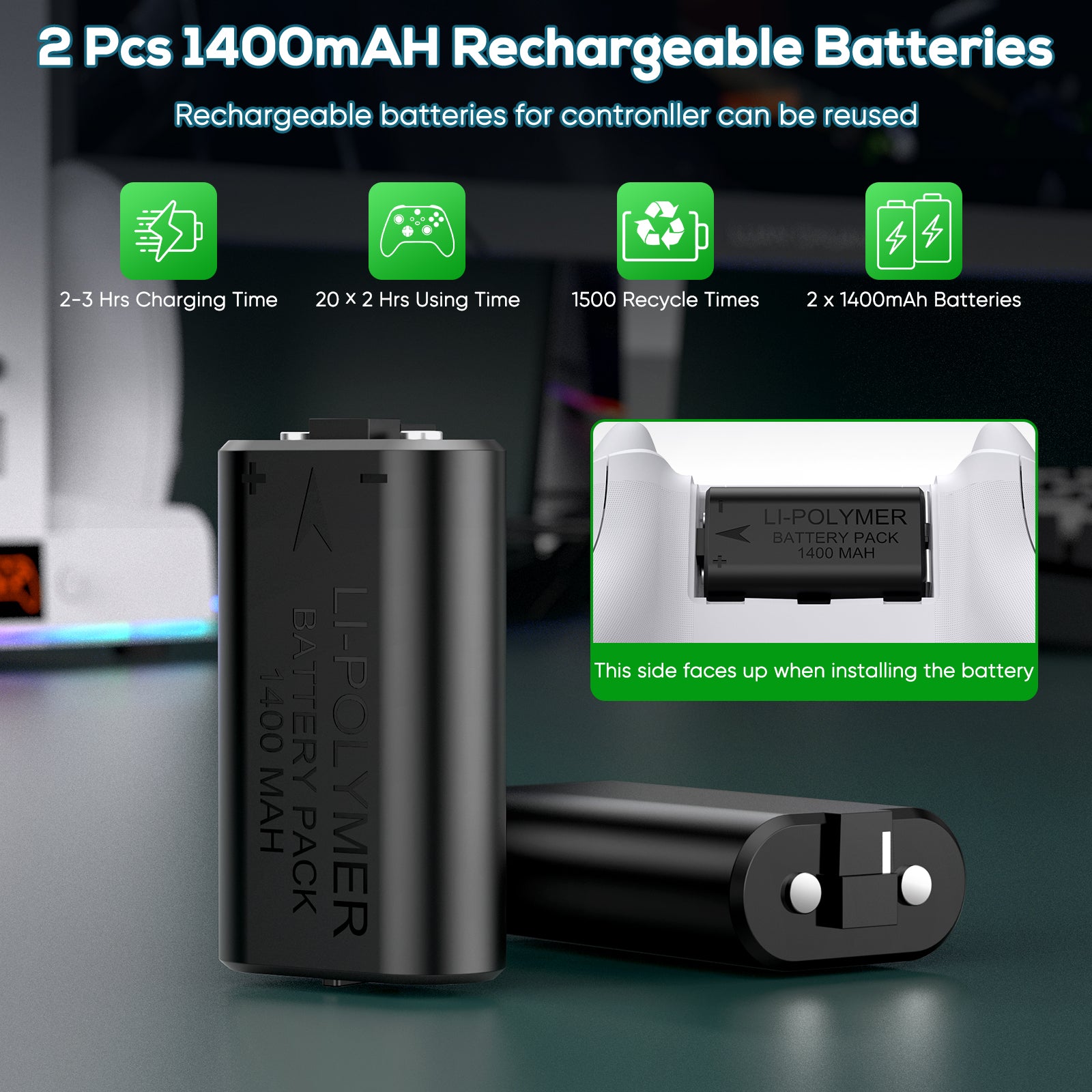 - [Fast Charger Station with Batteries]โโWith built-in over current/voltage/heat protection, the fast charging dock can fully charge controller in 2-3hrs with indicator. In addition, it comes with 2X 1400 mAh rechargeable batteries, which can be charged 1500 times and up to 40 hours of use. โ When installing the included battery, please place the text facing upwards. [Charging docks only work for xbox series s/x original rechargeable and included batteries]