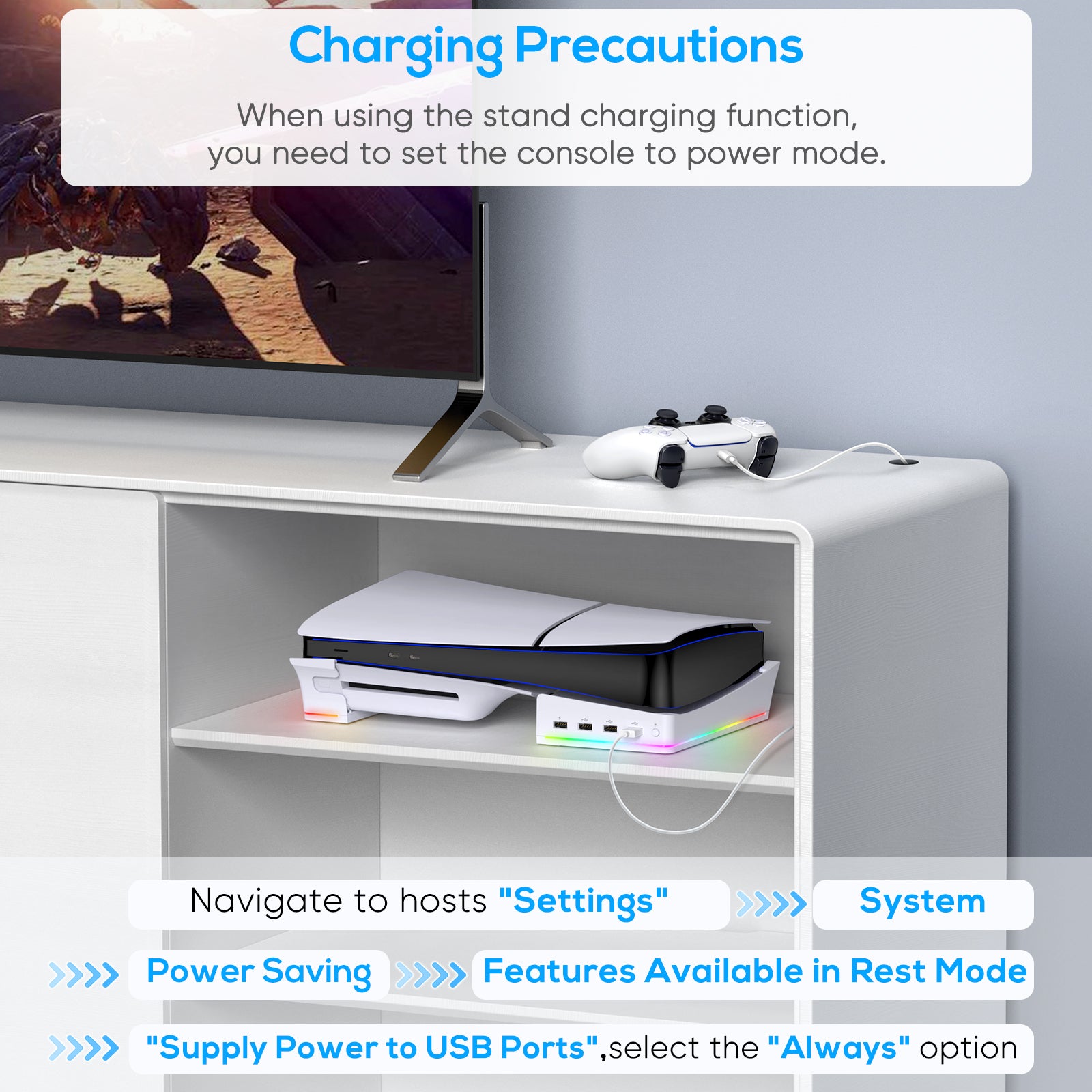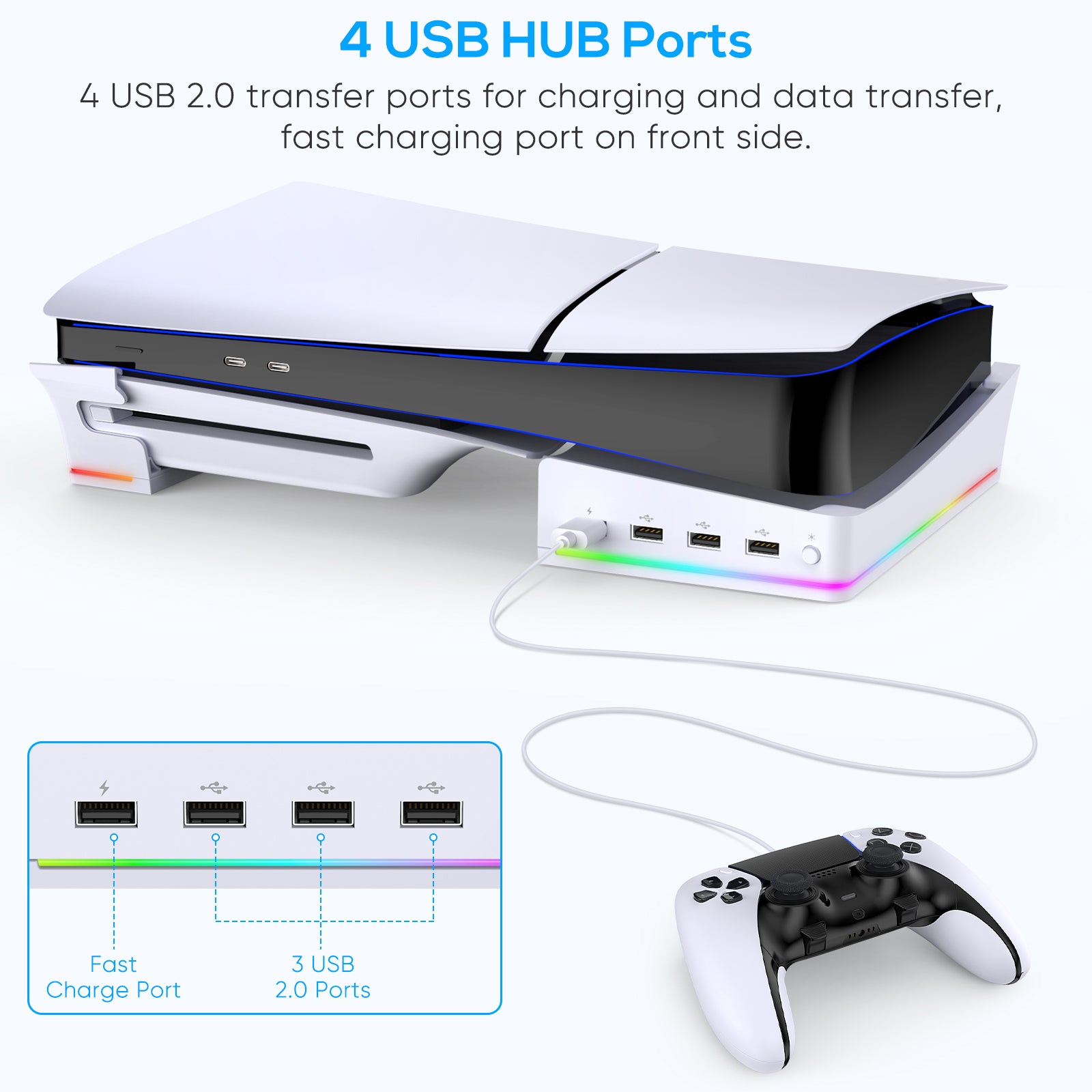 - 【4 x USB Expansion Ports】Horizontal stand with 4 USB hubs. 1 port for fast charging the PS5 DualSense/Edge controller and 3 USB 2.0 ports for data transfer or charging. [Note: Please connect the USB port on the rear of the PS5 console and set up continuous power for power.] Limited by the output capacity of the console port, the port is better suited for charging low-power devices such as mice, bracelets, and so on