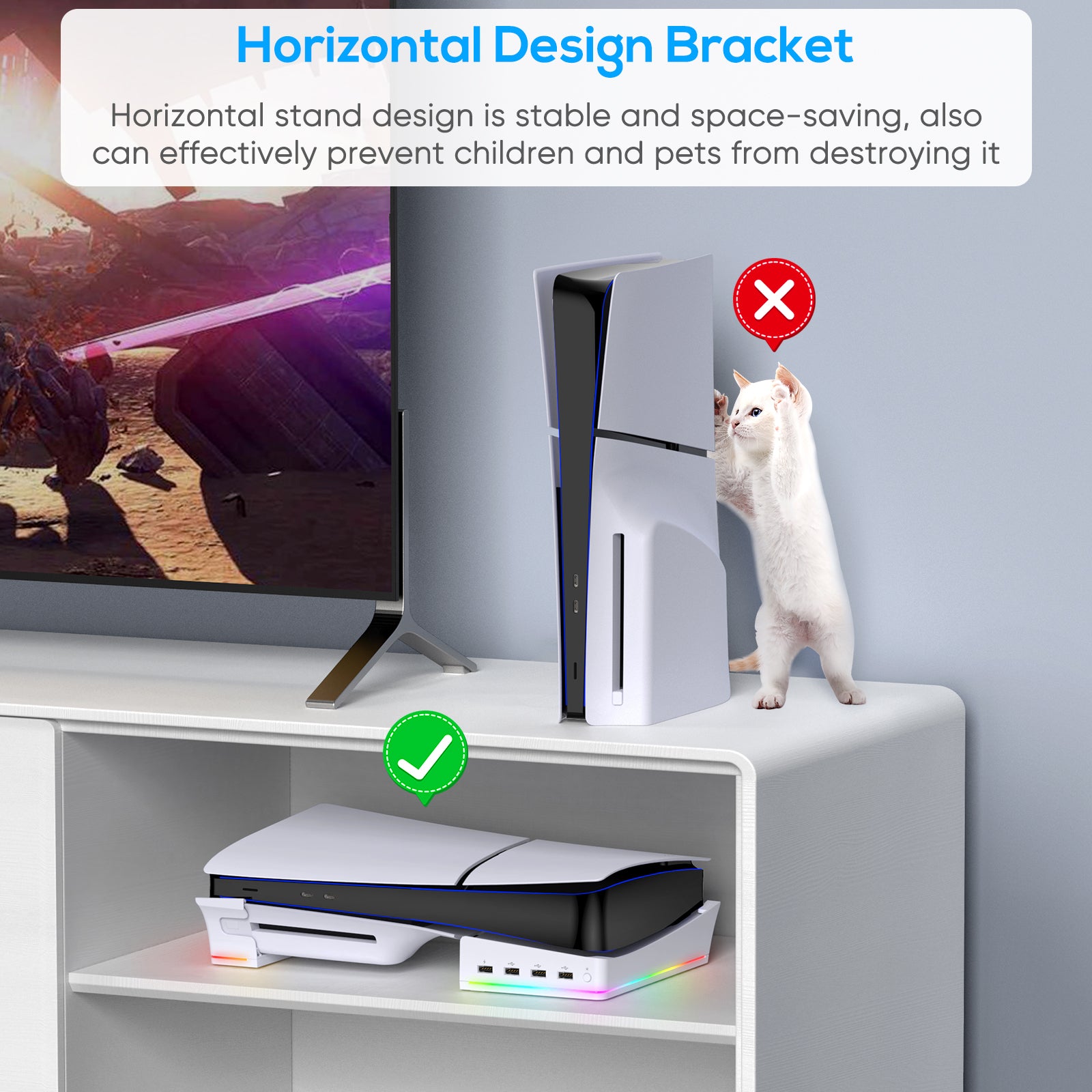- 【Protect for PS5 Slim Console】This horizontal stand is ONLY for PS5 Slim NEW Console( CFI-2000 Model Group-Slim), not for regular ps5 or older versions . Side stand is more stable than official stand, protecting the bottom panel from scratches and increasing the cooling area to accelerate heat dissipation. Extra 4 USB expansion ports for charging needs at the same time