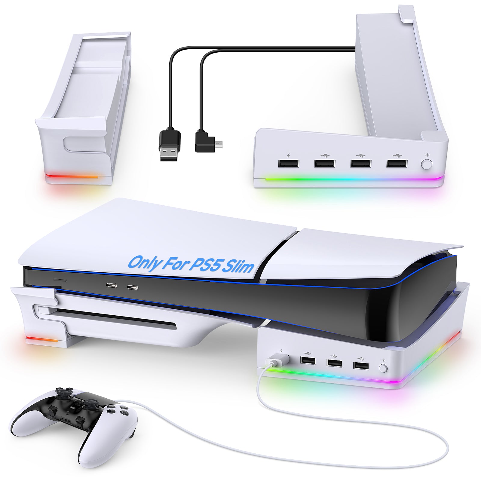 MENEEA Horizontal Stand for PS5 Slim Console with 4-USB Port Hub & 14 RGB Light Modes, Side Stand with P5 Controller Charging Data Port, Base Holder Accessories for Playstation 5 Disc & Digital -Slim