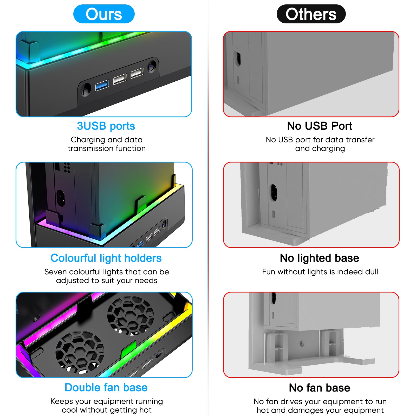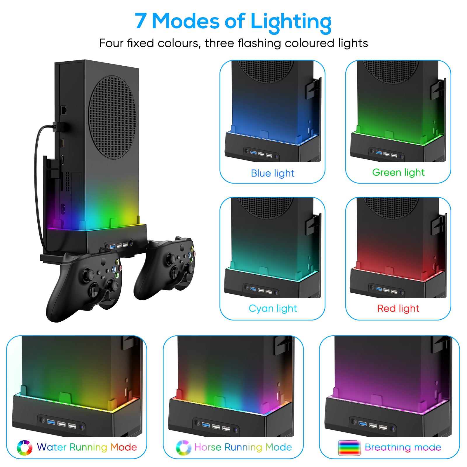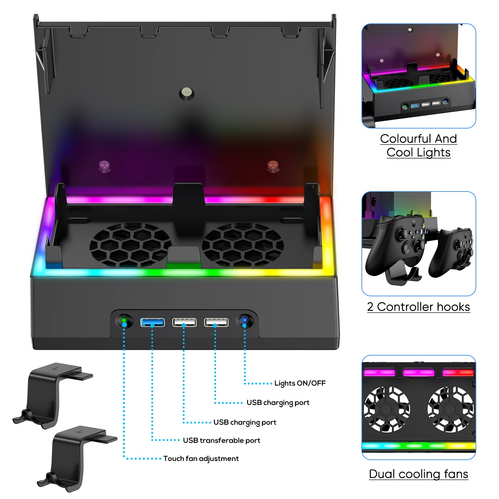 - USB Port & Controller Hook - The stand for series s comes with an extra hook for controller, so you don't have to worry about having nowhere to put your series s controller. In addition, there is one 3.0 transfer data USB port and two 2.0 USB charging ports to meet your different transmitting and charging port needs.