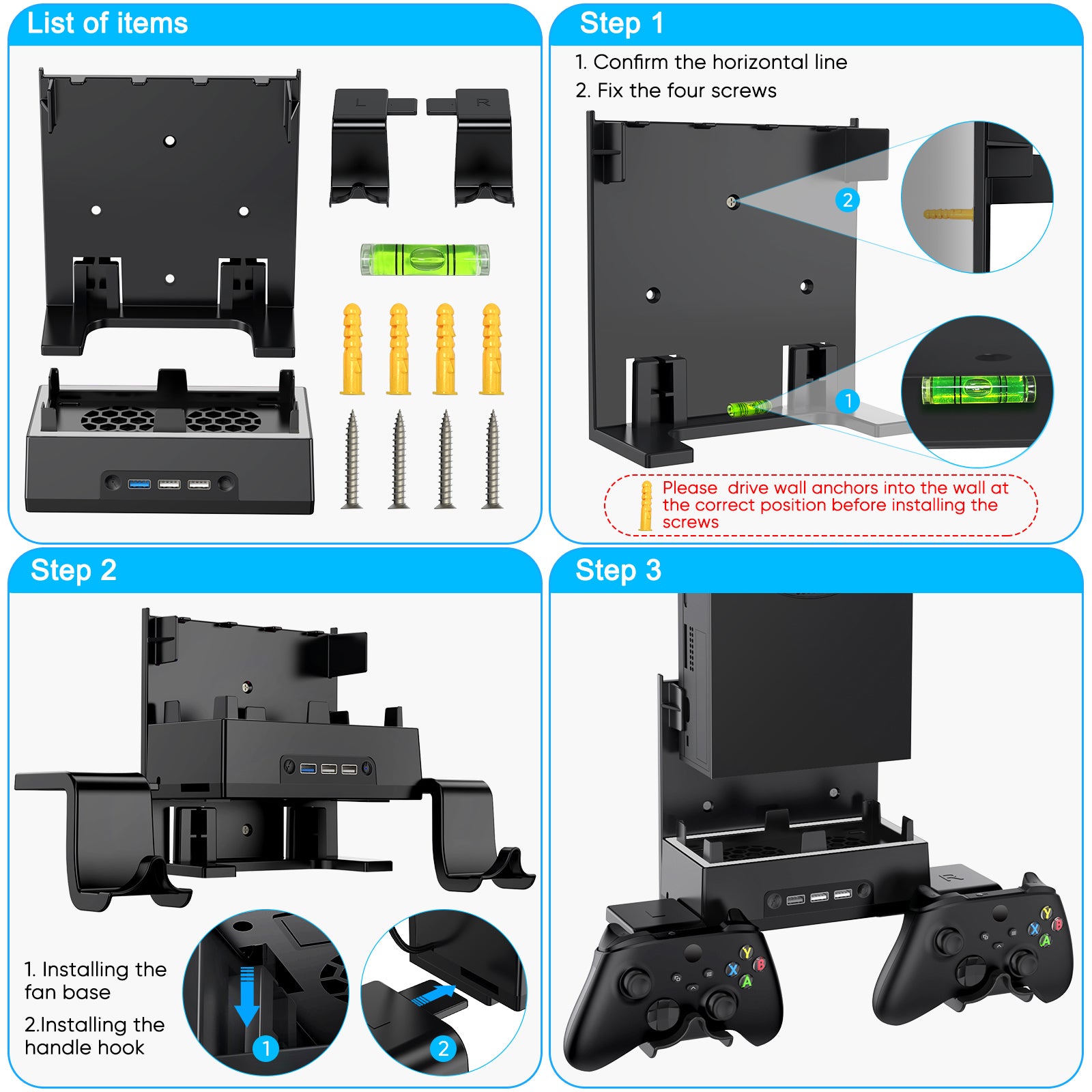 - Easy Installation - Built-in level shift and user manual help you install, the package includes 1x wall mount, 1x cooling bracket, 1x handle hook, 1x a bubble level, 4x screws, 4x wall anchors, 1x user manual.