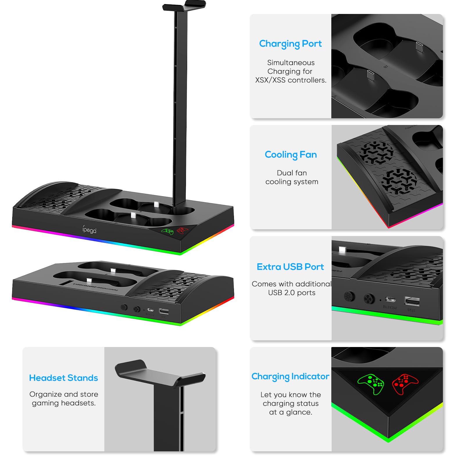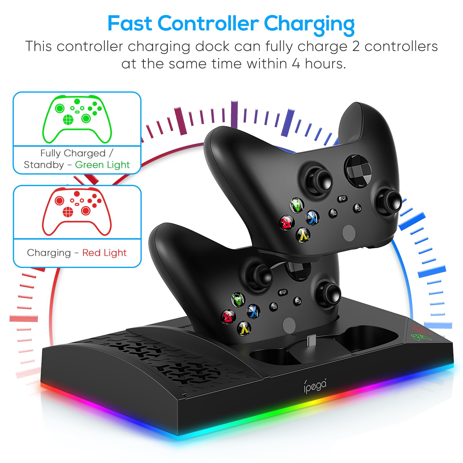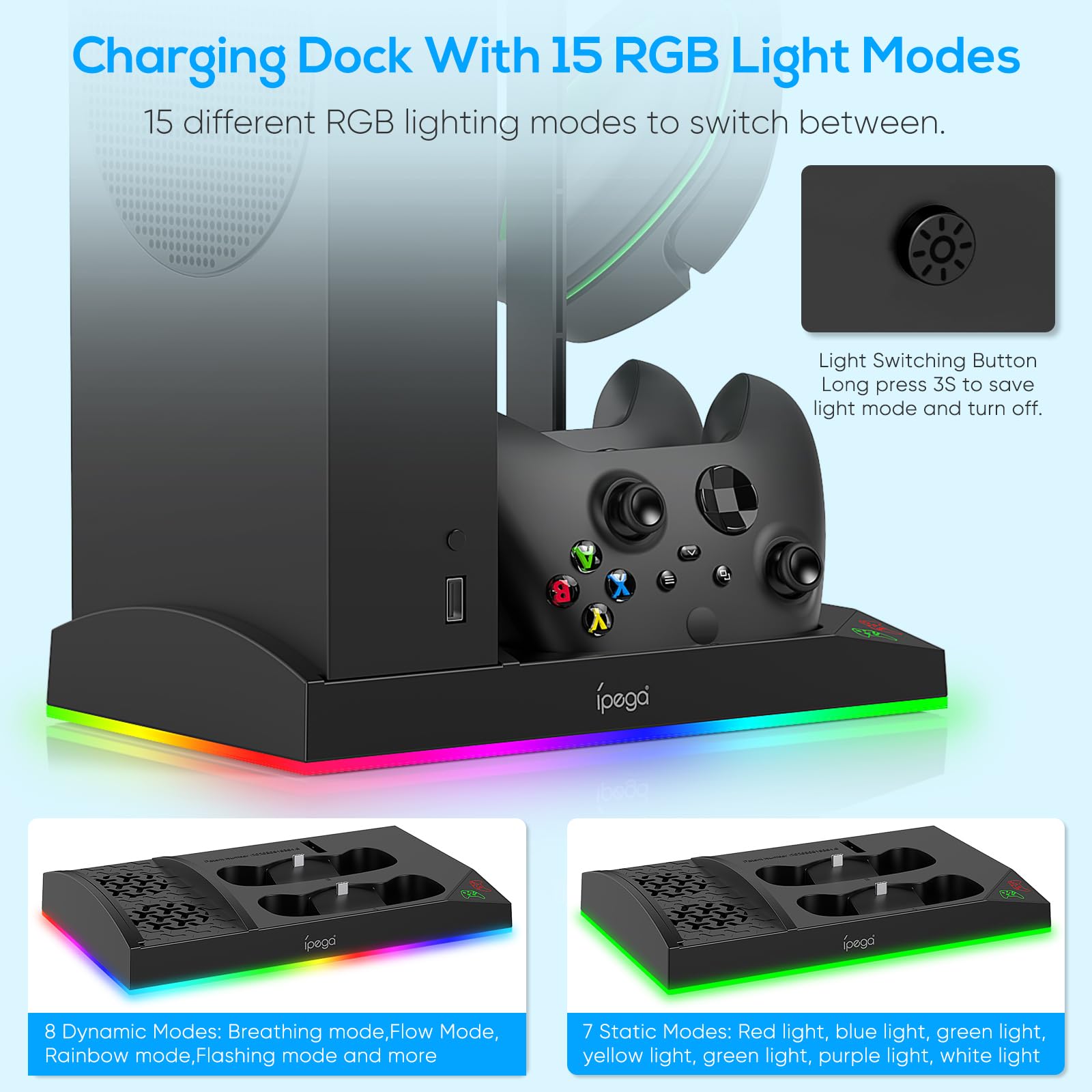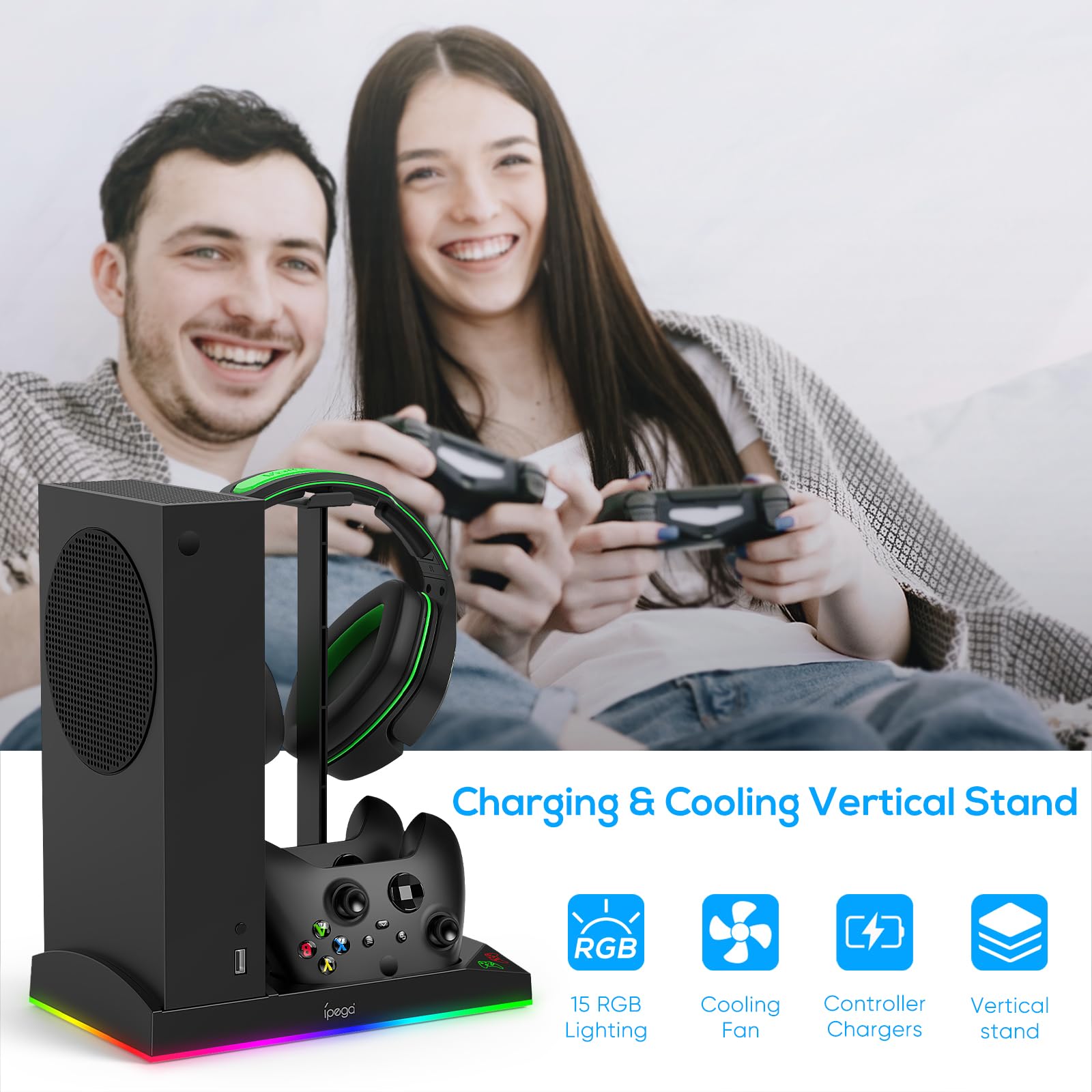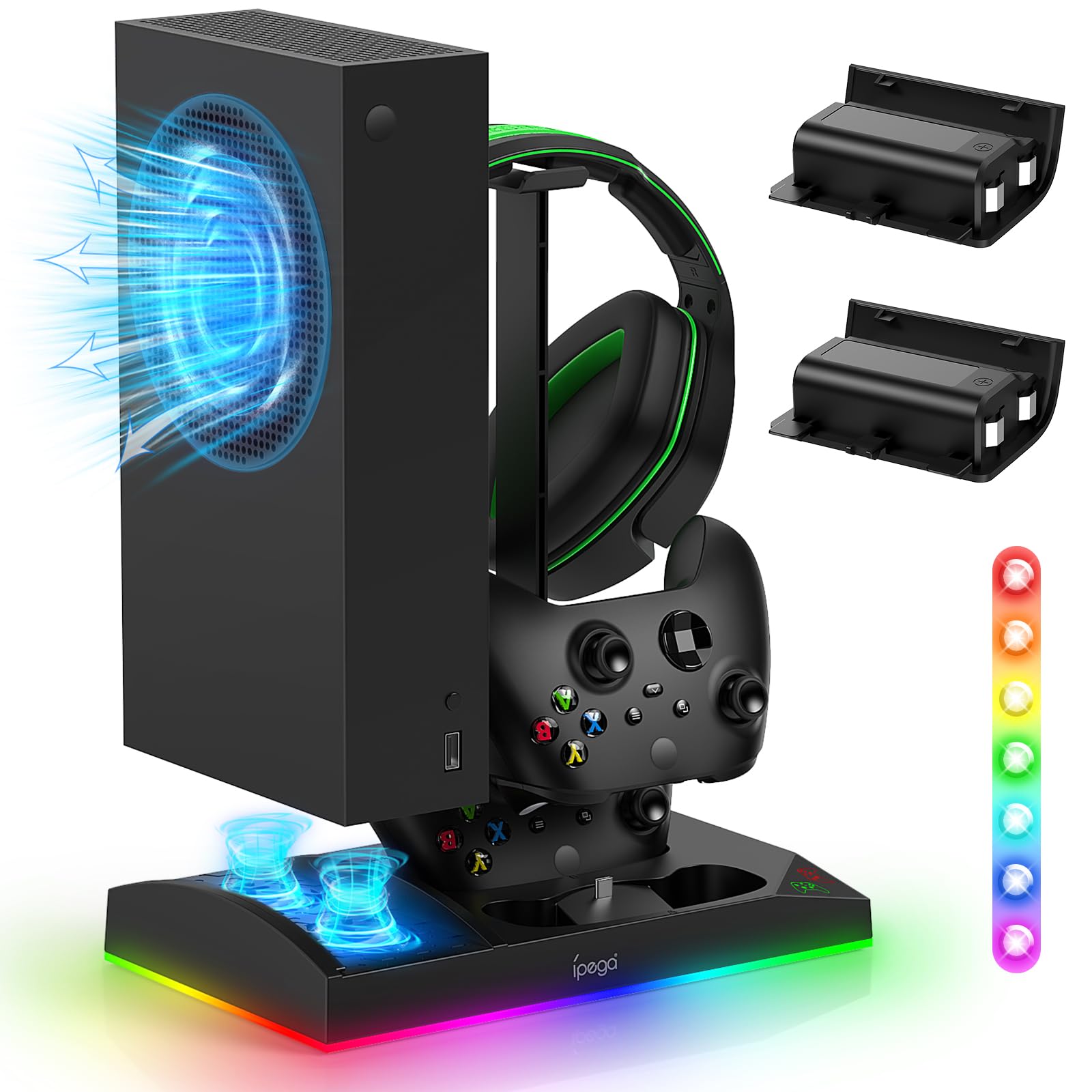 【6 in 1 Stand for XBOX SERIES S】: Vertical stand for Xbox Series S Console, built-in 2 fans for Xbox Series S Console, dual charger for 2 Xbox Series S Controllers,15 Colorfu l Light Modes, Earphone bracket,two 1400mAH battery packs,extra USB port.Good accessories in daily games, holiday presents are preferred.(NOT FOR XBOX ONE S,ONLY FOR XBOX SERIES S)