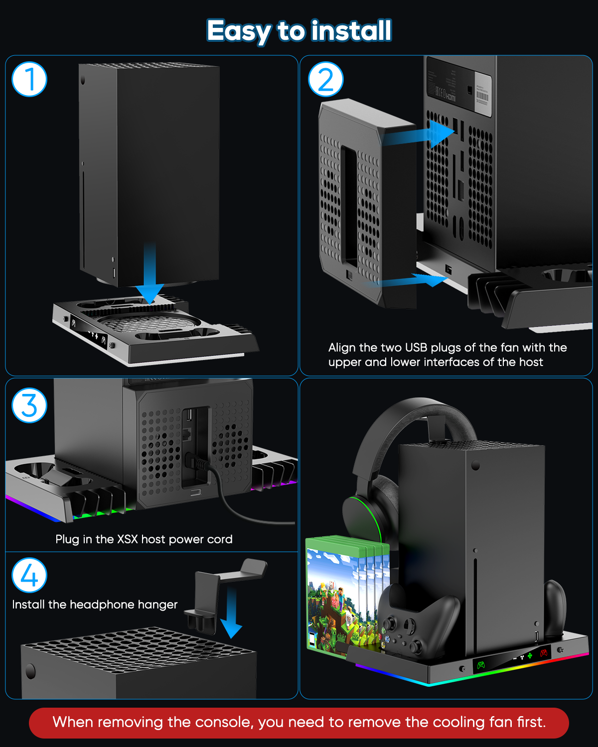 ❤️【Excellent Space Management & No Cable Required】: Perfect gift for Xbox Series X gaming enthusiasts! By keeping in a vertical position, the stand minimizes the space taken up by accessories for Xbox Series X. Simply install the cooling fan's male USB ports aligned with the charger dock's USB port and the console USB port. (NOTE: Please install the cooling fan in place, otherwise the fan will not work; Remove the fan first when disassembling the console. And the extra USB port supports charging.)