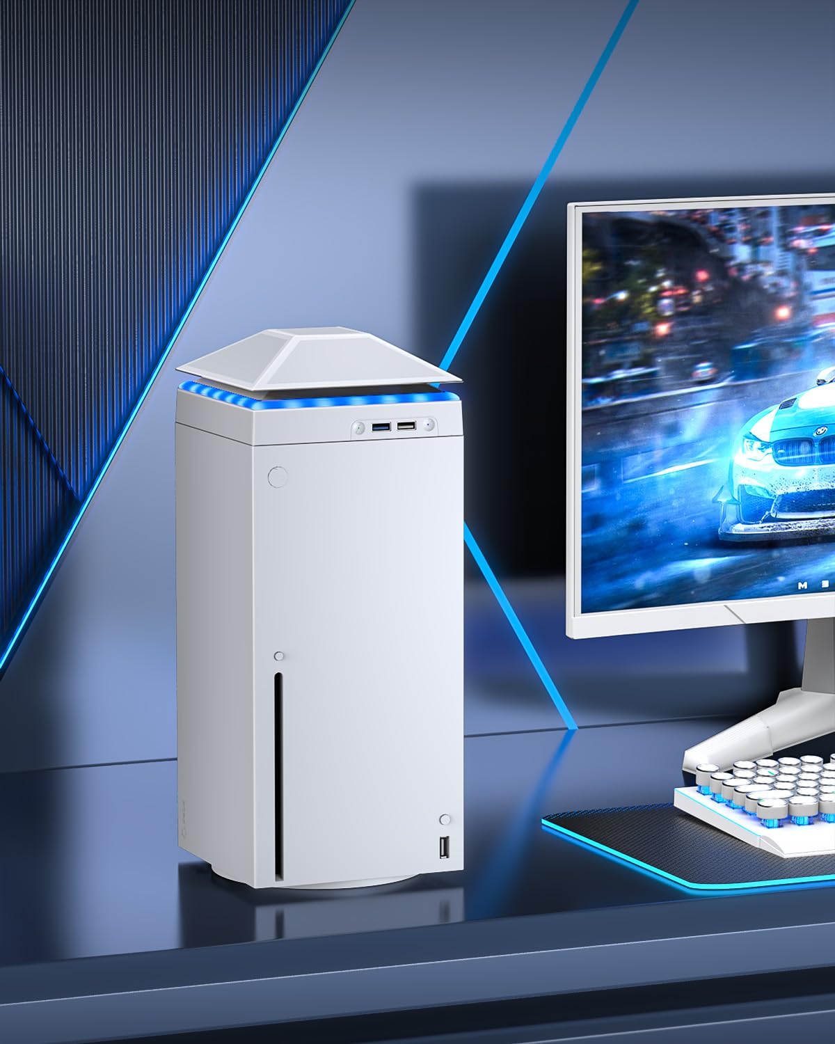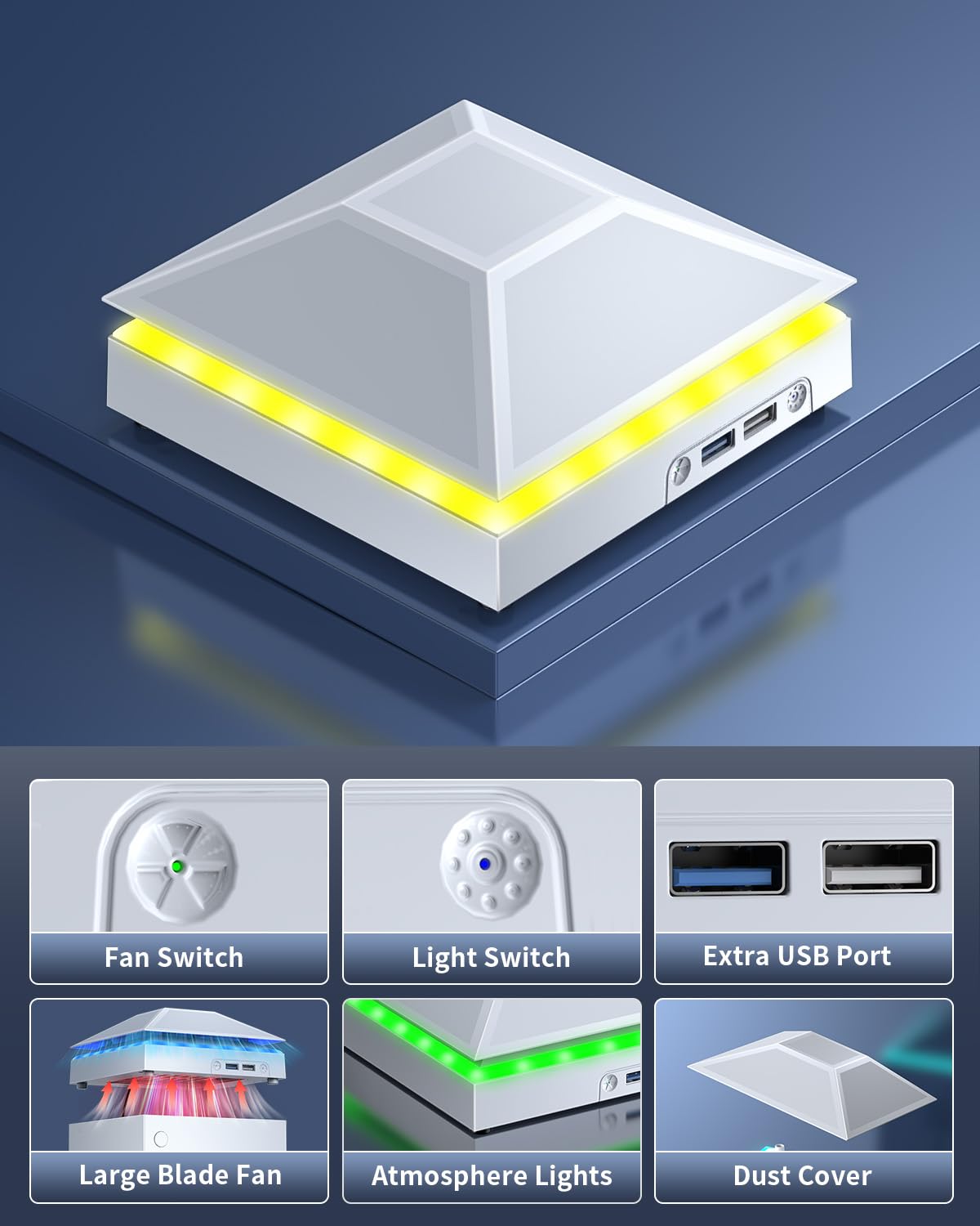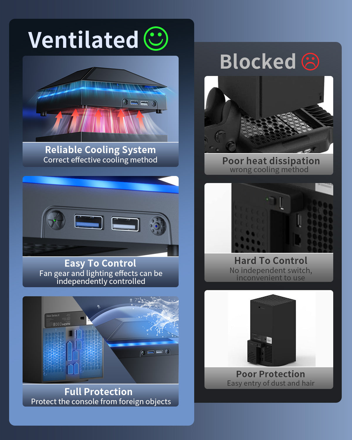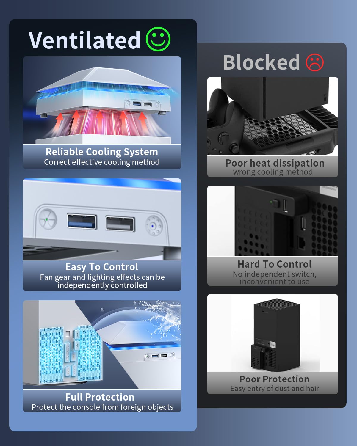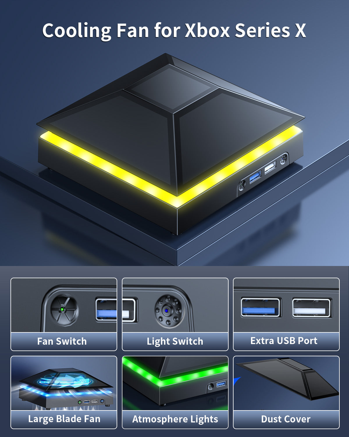 【Necessary for Xbox Series X】---- This product integrates many functions, such as top cooling fan, dust-proof, light strip, USB interface for data transmission and USB port for charging. It helps to prevent for Xbox Series X console from over-heating and dust to extend the life of your console. (NOTE:When the console is working, the dust cover of the fan can be removed to speed up the heat dissipation effect. Alige the two holes under the dust cover first, then cover the dust cover.)