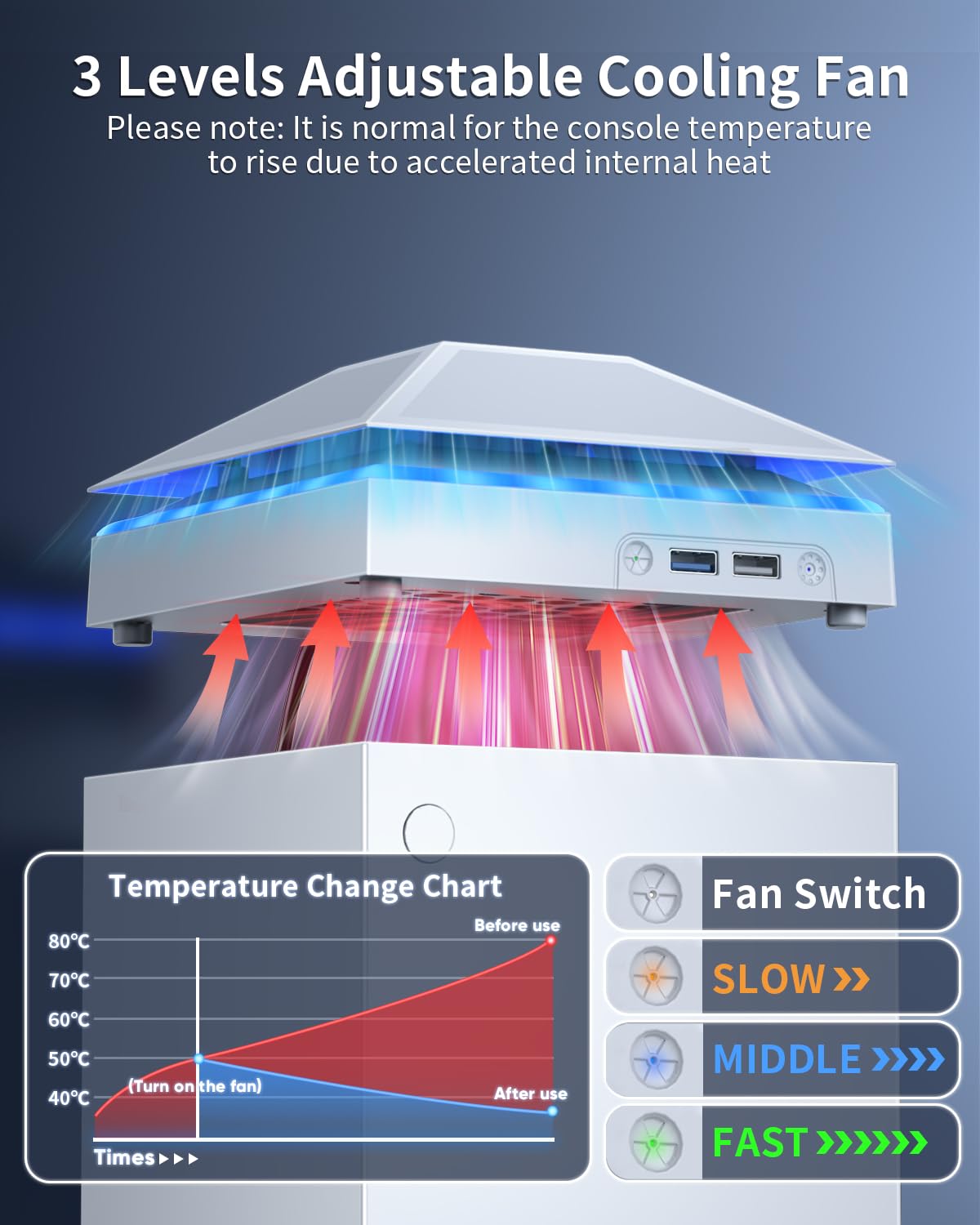 【Efficient Fan System】---- A high-speed large fan are built in the colorful dust-proof cooling fan,which can accelerate the hot air exhausted from the top of the console and reduce the temperature for Xbox series X console. The cooling fan stand with 3 gears and is a touch switch. The low gear is orange, the second gear is blue, and the high gear is green.The heat dissipation effect is more obvious, and the noise is very low, which you can hardly feel.
