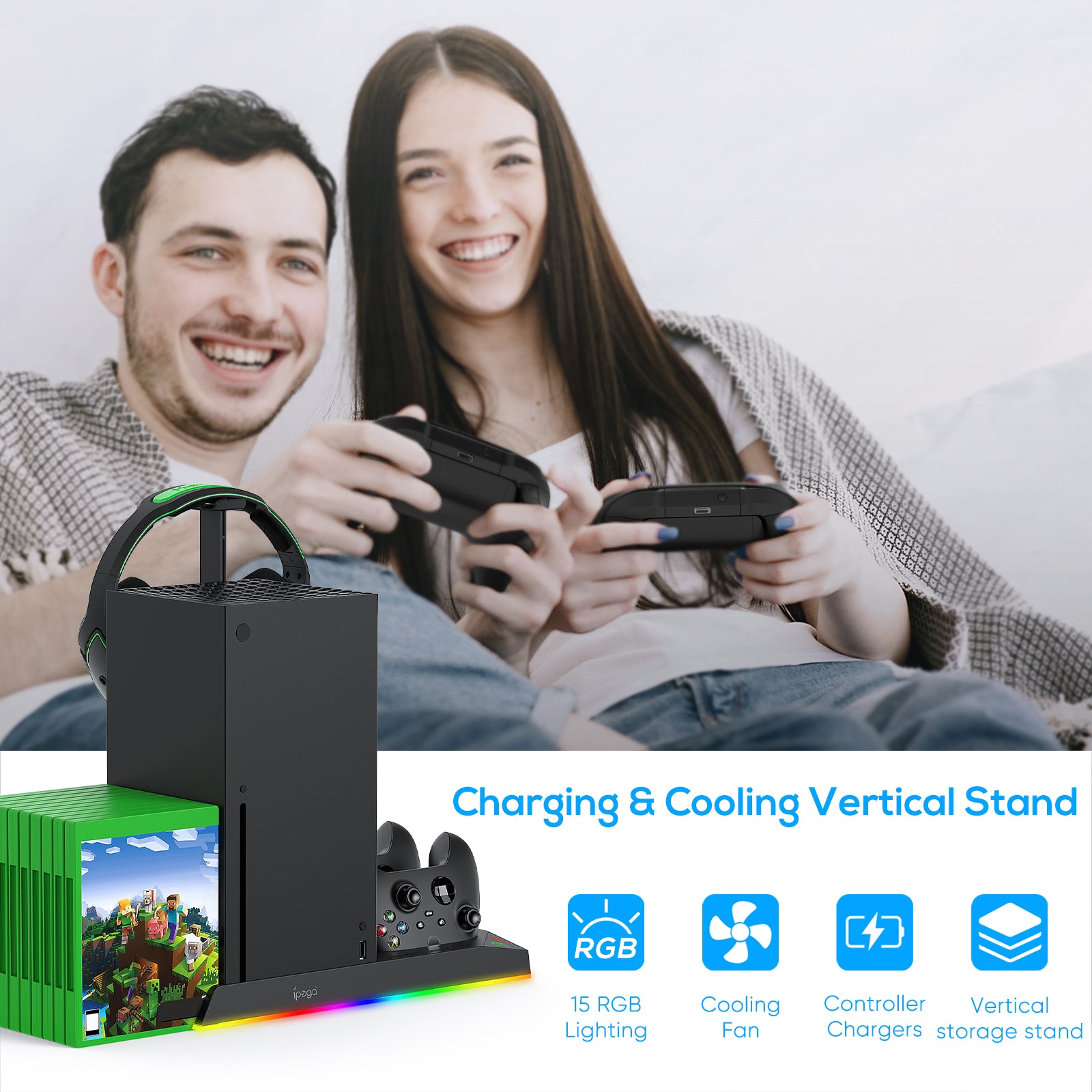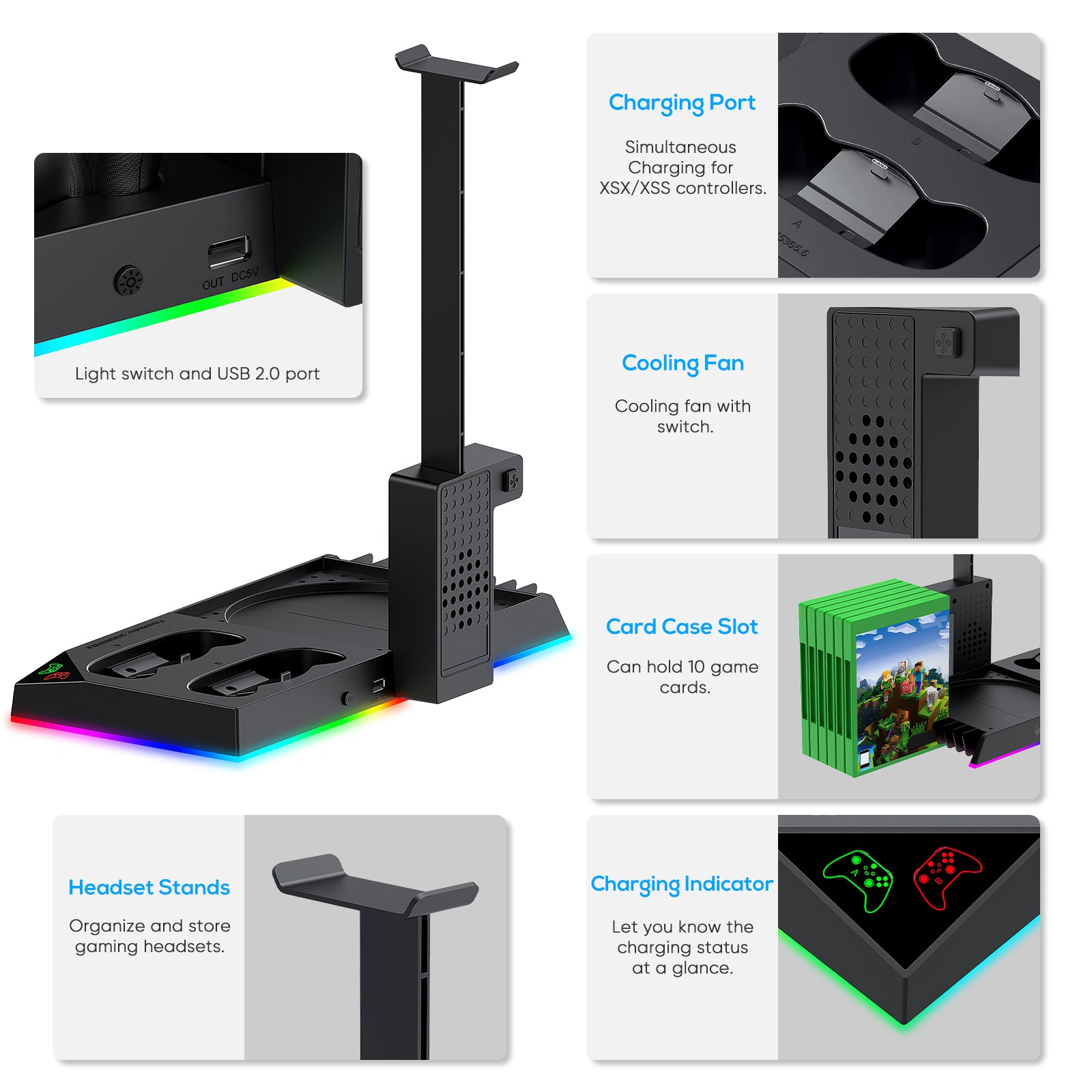 【6 IN 1 Stand for XBOX SERIES X】: Vertical stand for Xbox Series X combines the functions of console cooling fan, dual controller charger, 15 RGB lights modes, 2 x 1400mAh Rechargeable Battery, 10Pcs Game Discs, headset stand, extra USB port, etc.,which greatly saves the space for gaming equipment,perfect integrated design to provide all the extra features you need. 【Please Note: The console, controllers, headset,charger cable and games are NOT included】